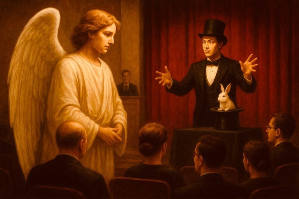 Namun, di tengah ruang sidang yang megah, ia tertegun. Bukan doa yang menggema, melainkan bisik-bisik strategi.Bukan kesederhanaan yang tampak, melainkan kepiawaian memainkan trik dan intrik — seolah para pemain sulap sedang mempertontonkan keahliannya di panggung yang disebut “pelayanan”.